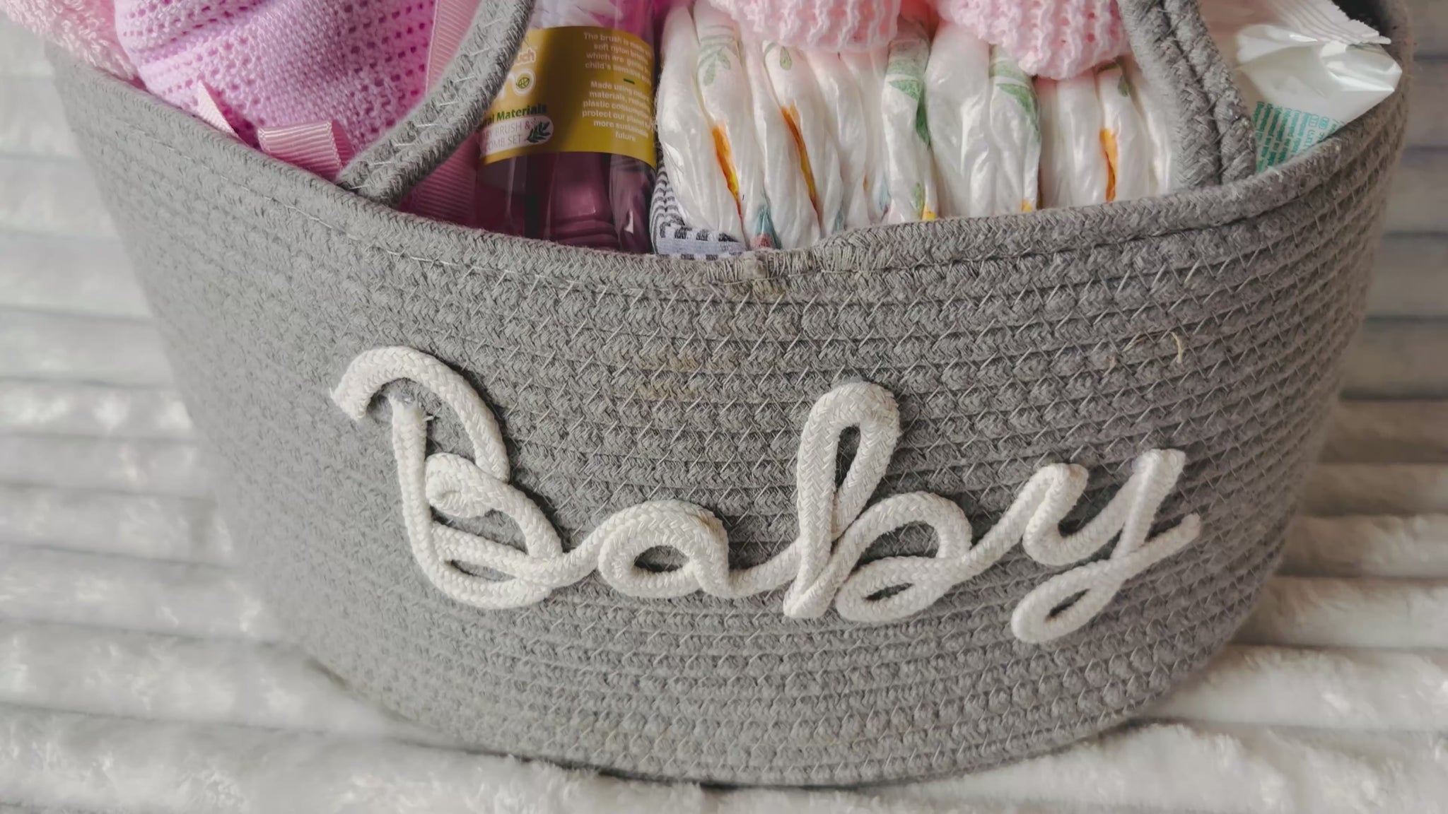 All items are neatly arranged in a spacious, durable nappy caddy, making it easy for parents to keep everything organised—whether by the changing table or on the go. Shredded paper is used to keep items together and reduce movement during shipping. Each nappy caddy is then wrapped In clear cellophane and finished with a ribbon bow ready to be gifted.